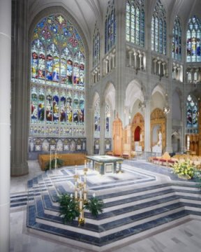 Interior of Cathedral In 1919, Bishop Brossart oversaw the installation of a new high altar in the cathedral. The Carrara marble altar measured 23 feet in height and 20 feet in width and was said to have weighed 30,000 pounds. The altar has a hand carved marble crucifix and two wooden angels created by artists in Austria.